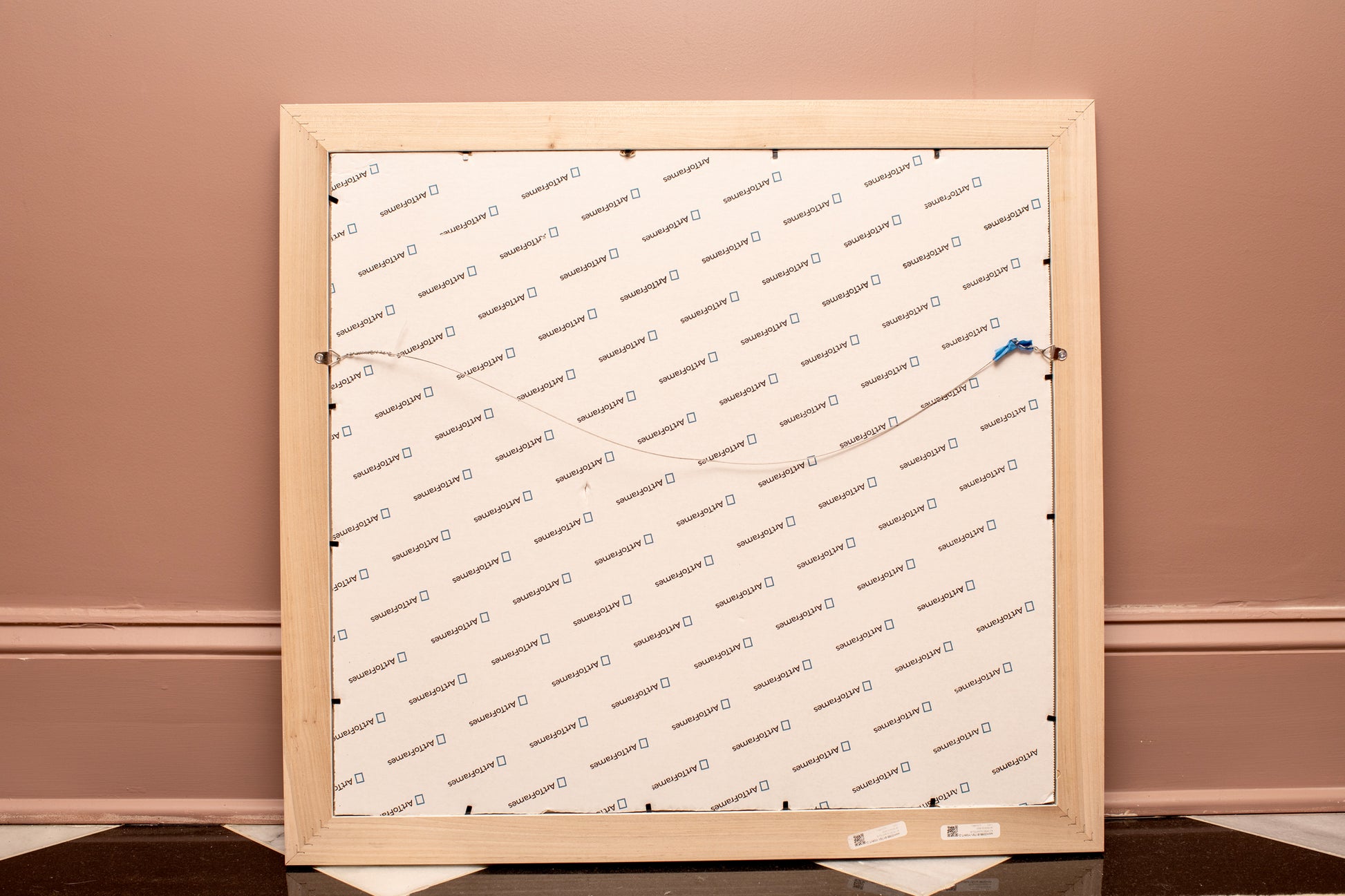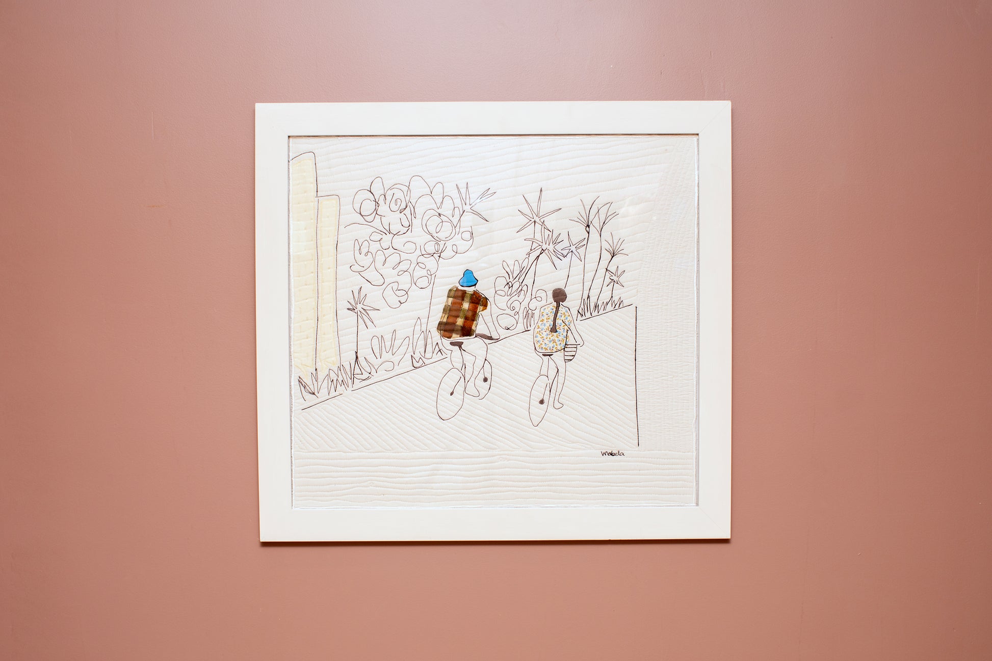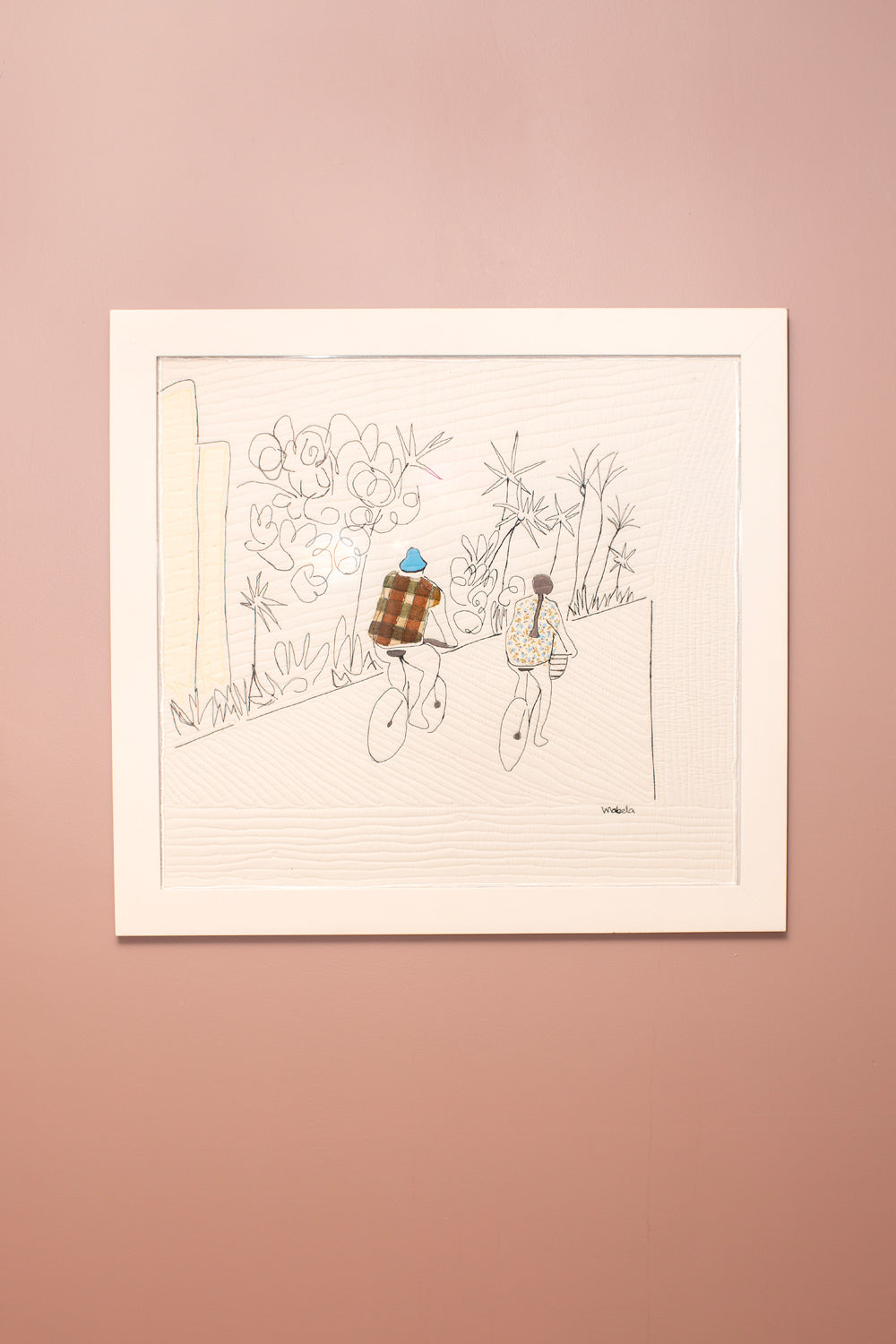 Framed minimalist yet evokative quilted painting of a bicyclist couples slice of life. One of a kind piece signed by the artist "Mabela" in thread. Shown at The Contemporary Art Modern Project in Miami April 15-May 30th, 2022.