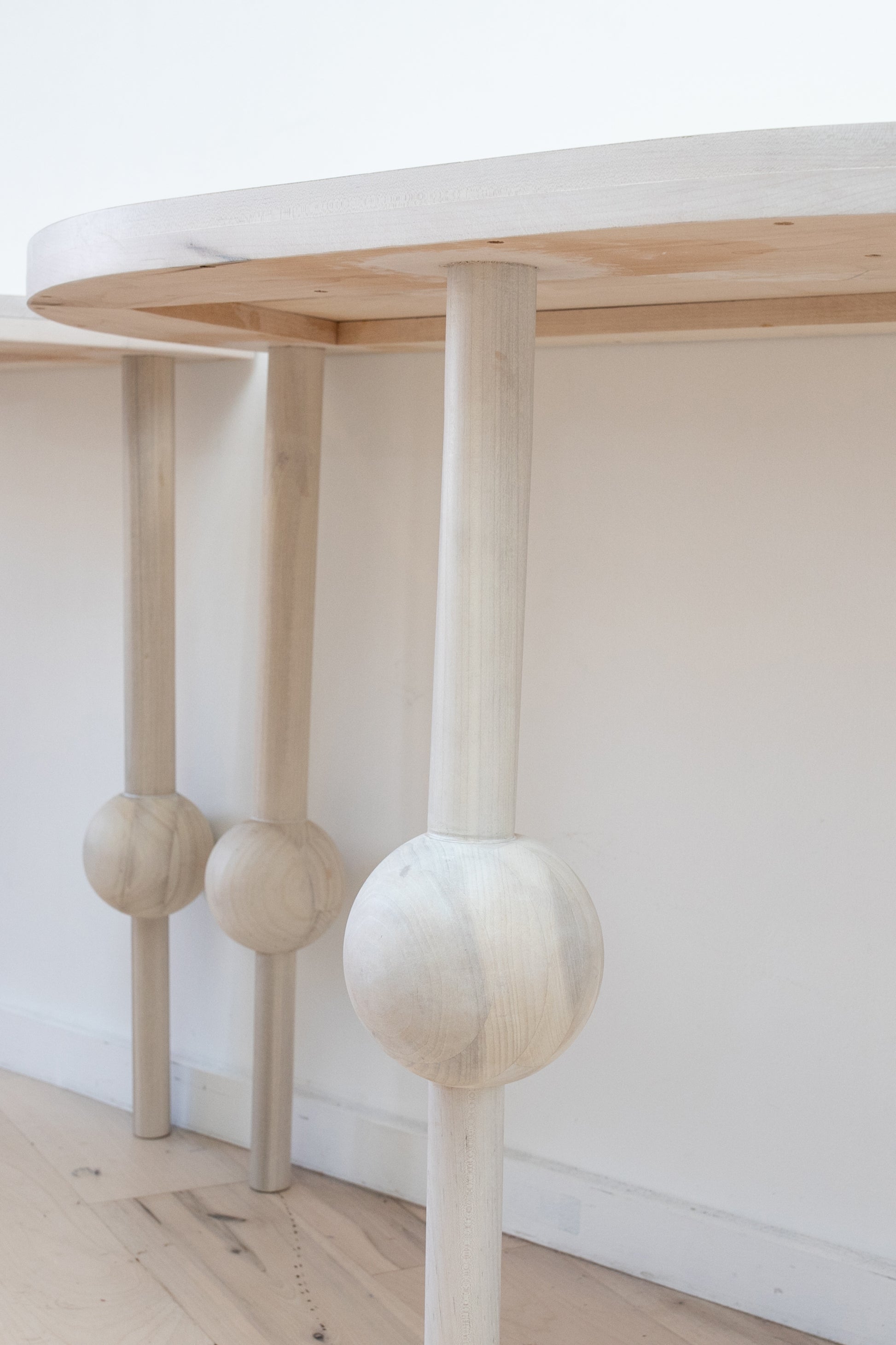 Sculptural ivory white demilune side table with asymmetrical spheres on legs by Farnady Interiors