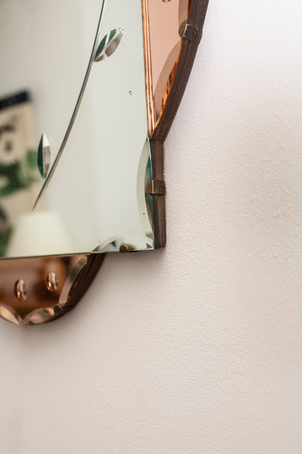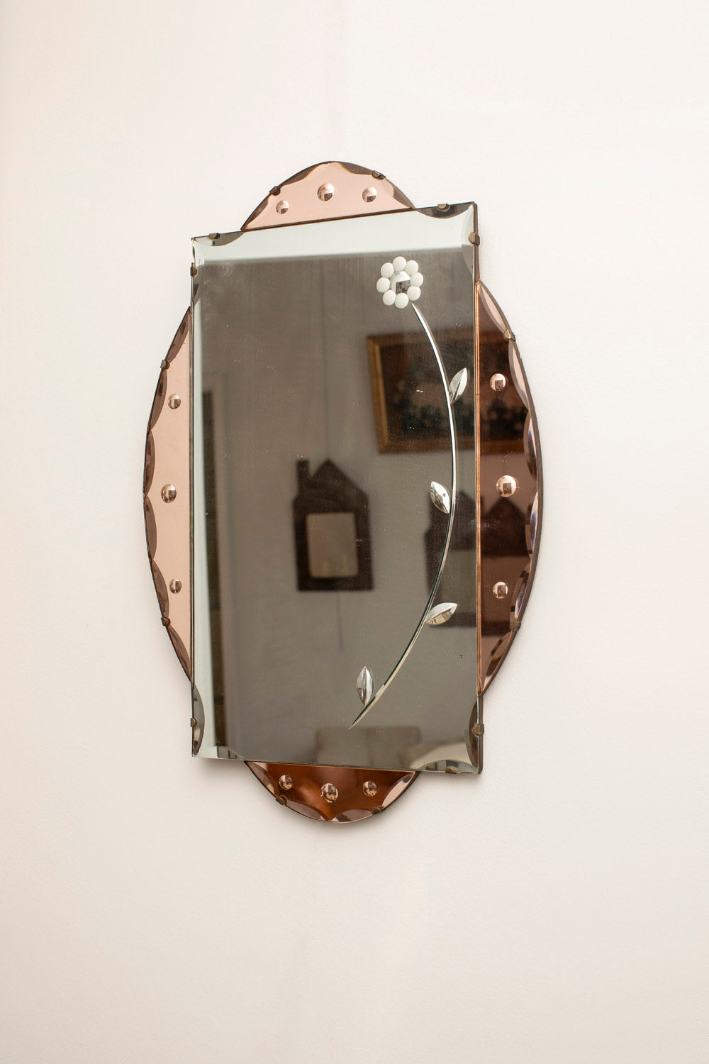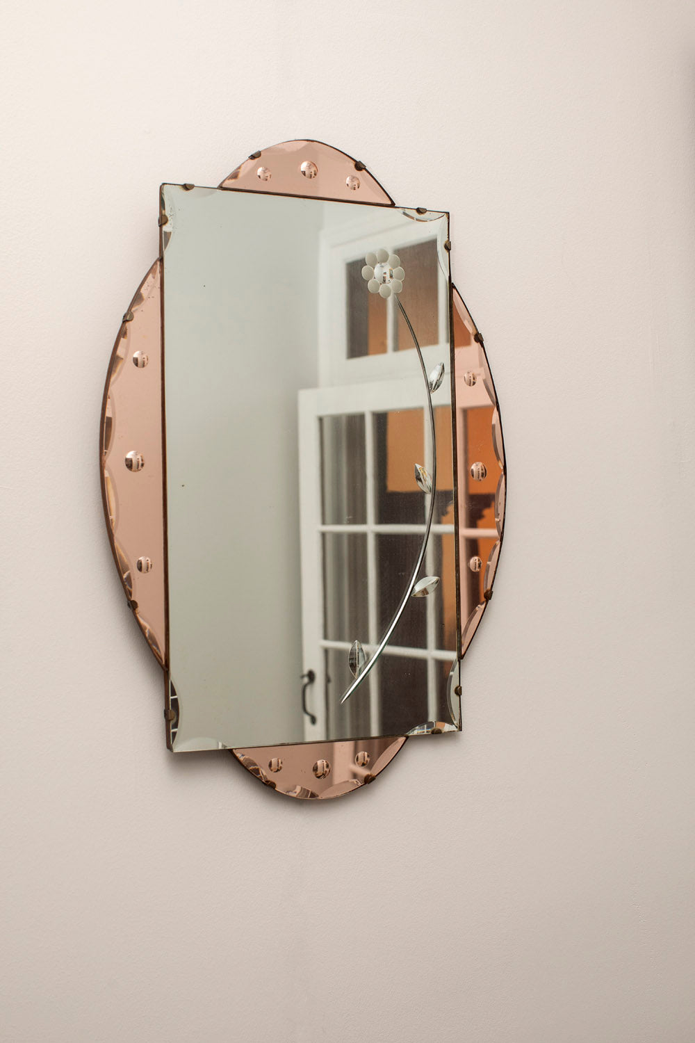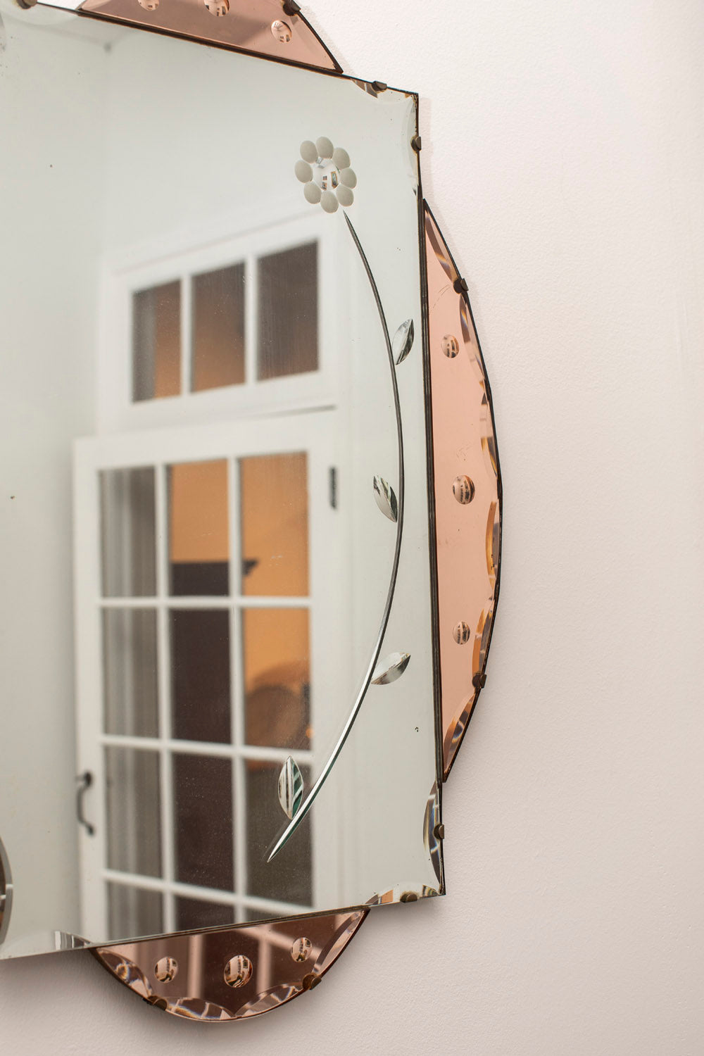 Beautifully feminine églomisé scallop frame mirror with flower etching and pink glass