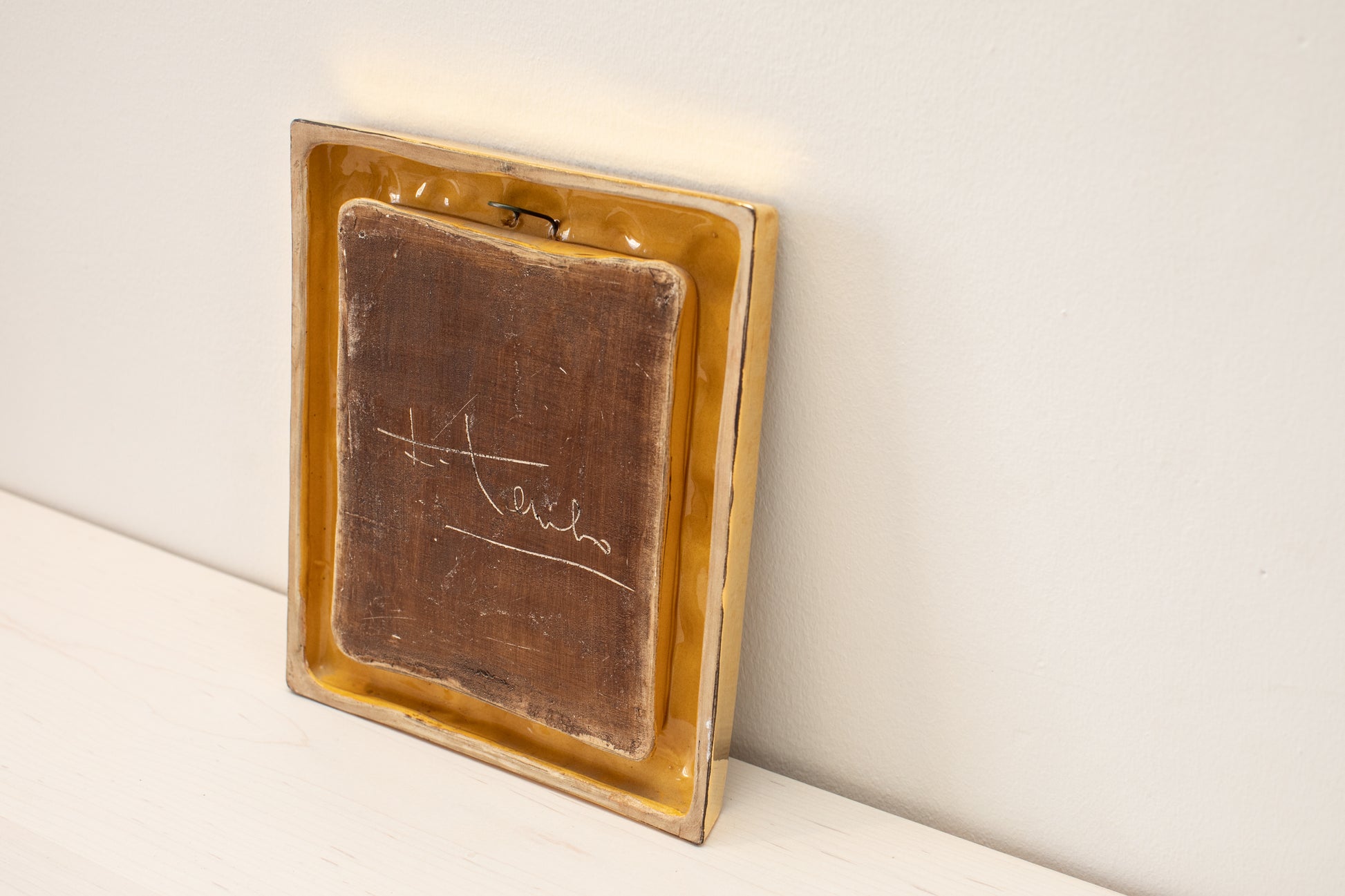 Signed gold ceramic mirror with red and black jewel embellishment