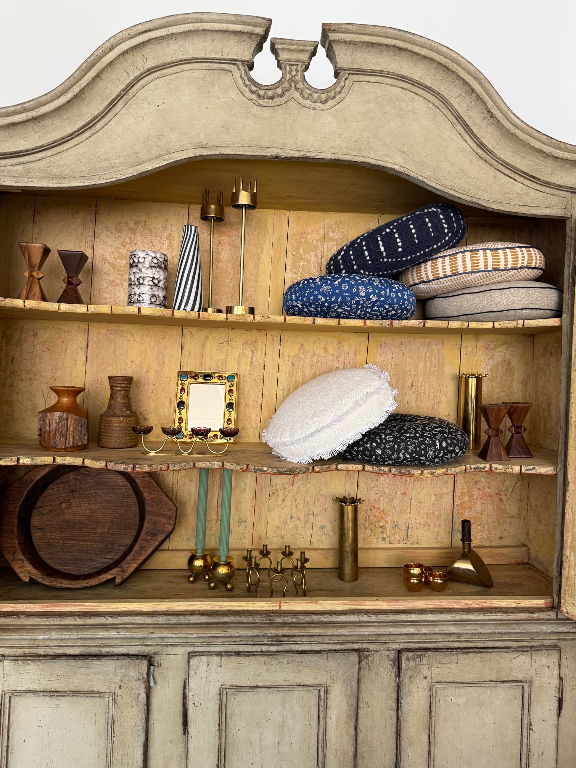 A chic round pillow addition to a couch or bed in a rich navy blue and white striped boucle fabric by Rosemary Hallgarten. Designed by Danielle Naeve and made locally in DC.