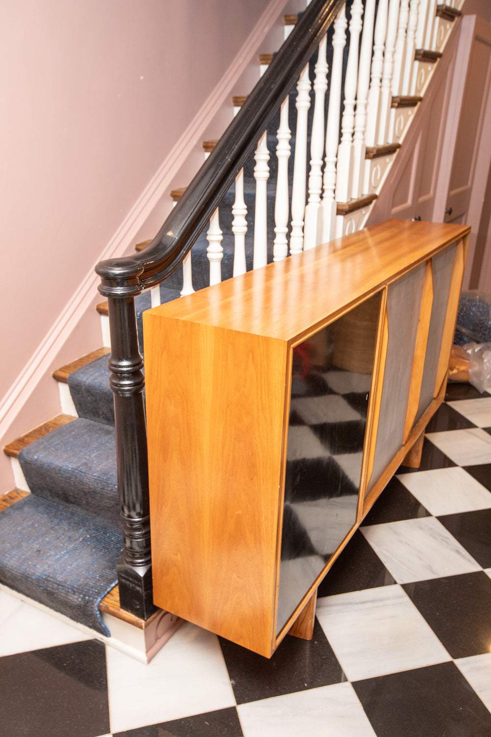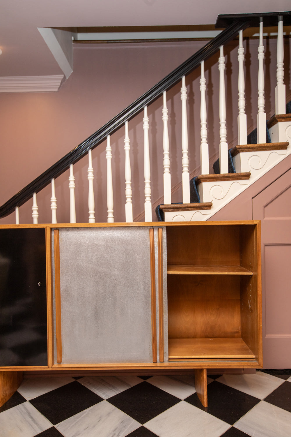 Beautiful wooden credenza with metallic silver and black lacquer doors designed in the manner of Charlotte Perriand's Cansado pieces and Jean Prouve